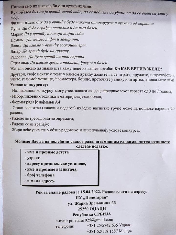 Драги другари, наши полетарци, са великом радошћу Вас обавештавамо да је отворен наш 16.ликовни конкурс „Пролеће 2022“, на тему: „Вртић какав желим.