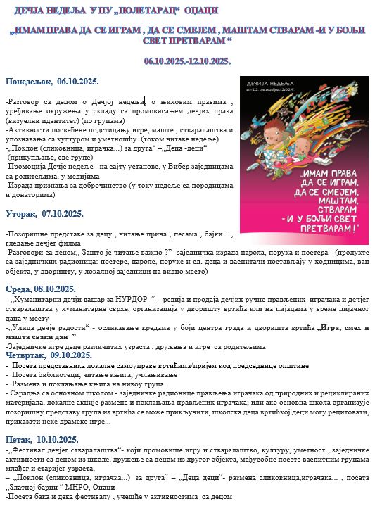 ,,ИМАМ ПРАВА ДА СЕ ИГРАМ , ДА СЕ СМЕЈЕМ , МАШТАМ СТВАРАМ – И У БОЉИ СВЕТ ПРЕТВАРАМ“ by admin · 6. октобар 2025. Програм дечје недеље у нашој Установи. Дечја недеља 2025.